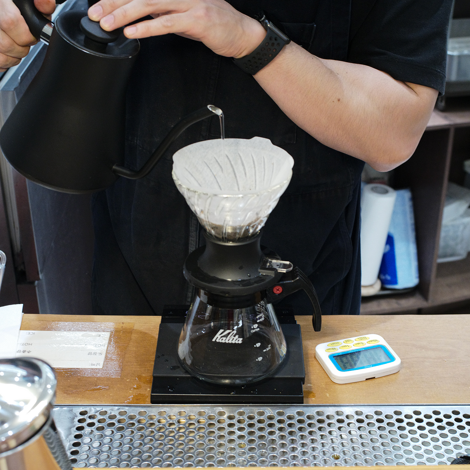 매뉴팩트 커피 사용법 _ 하리오 스위치 준비물하리오v60드리퍼, 서버, 하리오필터, 드립포트(주전자), 뜨거운 물 , 저울, 초시계 추출조건원두 ㅣ GGGM입도 ㅣ EK43기준 10.5p (0-16단위)도징양 ㅣ16g추출 시간 ㅣ 3:10초푸어량 ㅣ 250ml 푸어추출 온도 ㅣ 93도 추출순서1. 하리오 스위치에 필터지를 넣은 후 린싱해줍니다.2. 분쇄 된 원두 16g을 넣습니다.3. 하리오 스위치를 닫은 상태에서 50ml를 푸어합니다. (아이스의 경우 서버에 얼음 60g을 담아줍니다)4. 40초가 되면 스위치를 열고 고여 있는 물을 떨어트립니다.5. 50초가 되면 스위치를 닫고 250ml까지 한 번에 푸어합니다.(아이스의 경우 200ml까지 한번에 푸어합니다.) 6. 2:20초가 되면 스위치를 열어줍니다. 7. 추출이 끝나면 예열 되어 있는 컵에 옮겨 마십니다.(아이스의 경우 얼음 컵에 옮겨 마십니다.) 참고사항1. 산미를 더 표현하고 싶으면 원두 양을 올려줍니다. 반대로 산미가 강하게 느껴지면 원두양을 줄여줍니다. 2. 스위치는 물이 내려가는 방식이 아닌 스위치를 열 때까지의 침출 시간이 맛을 크게 좌우합니다. 시간이 너무 짧으면 가볍고 과소추출이 이루어질 수 있고 시간이 너무 길면 과다추출이 이루어질 수 있습니다. 3. 스위치는 일반 v60보다 분쇄를 조금 더 굵게 사용하는 경우가 많습니다. 쓴맛이 강하면 더 굵게 분쇄해 주시고 맛이 연하면 더 가늘게 조절합니다.4. 스위치는 물 온도의 영향을 크게 받습니다. 쓴맛, 무거움이 느껴지면 물 온도를 낮춰주고 맛이 가볍고 산미가 강조되면 물 온도를 올려줍니다. A. 따뜻한 커피 추출조건원두 ㅣ 매뉴팩트 싱글 라인업, 샌프란시스코 (미디움 정도로 로스팅 된 원두)입도 ㅣ 소금보다 약간 굵은 정도, ek43 기준 10p도징양 ㅣ18g추출 시간 ㅣ2:50~3:00추출량 ㅣ 약 200g~210g추출 온도 ㅣ 93도 추출순서1. 뜸은 40g의 물을 사용합니다. 중심부에서 시작하여 천천히 원을 그리면서 나가주세요.2. 30초가 지나면 스위치를 닫고 저울 눈금이 250g이 될 때까지 부어줍니다. 처음에는 중간 굵기의 물줄기로 원을 그리면서 나가다가 원두를 다 적시고 수위가 올라오면 굵은 물줄기로 나갔다가 들어와주세요.3. 2:15가 되면 스위치를 열어주세요.4. 드리퍼 제거는 커피베드와 수위가 일치할 때 진행해주세요. 참고사항1. 브루잉 시작 전 서버와 스위치에 따듯한 물을 담아 예열해주세요. 침출 방식의 드리퍼를 사용하기에 충분한 예열이 필요합니다.2. 황색이 아닌 필터지는 린싱하지 않아도 괜찮습니다. 린싱한 필터지를 사용하실 경우, 원두를 담은 뒤 바로 추출을 시작해주세요.3. 침출 방식의 드리퍼를 사용하였기에 섬세한 물줄기를 사용할 경우, 성분들의 원활한 추출이 저해될 수 있어요. 강한 유속을 통해 원두가 고루 섞일 수 있도록 푸어링을 진행해주세요.4. 본인의 입맛에 따라 자유롭게 변형하여 사용해 주세요. B 아이스 커피 추출조건원두 ㅣ 매뉴팩트 싱글 라인업, 샌프란시스코 (미디움 정도로 로스팅 된 원두)입도 ㅣ소금보다 약간 굵은 정도, ek43 기준 10p도징양 ㅣ19g추출 시간 ㅣ2:50~3:00추출량 ㅣ 약 120~130g추출 온도 ㅣ 93도 추출순서1. 뜸은 40g의 물을 사용합니다. 중심부에서 시작하여 천천히 원을 그리면서 나가주세요.2. 30초가 지나면 스위치를 닫고 저울 눈금이 150g이 될 때까지 부어줍니다. 처음에는 중간 굵기의 물줄기로 원을 그리면서 나가다가 원두를 다 적시고 수위가 올라오면 굵은 물줄기로 나갔다가 들어와주세요.3. 2:30가 되면 스위치를 열어주세요.4. 드리퍼 제거는 커피베드와 수위가 일치할 때 진행해주세요. 참고사항1. 브루잉 시작 전 서버와 스위치에 따듯한 물을 담아 예열해주세요. 침출 방식의 드리퍼를 사용하기에 충분한 예열이 필요합니다.2. 황색이 아닌 필터지는 린싱하지 않아도 괜찮아요. 린싱한 필터지를 사용하실 경우, 원두를 담은 뒤 바로 추출을 시작해주세요.3. 침출 방식의 드리퍼를 사용하였기에 섬세한 물줄기를 사용할 경우, 성분들의 원활한 추출이 저해될 수 있어요. 강한 유속을 통해 원두가 고루 섞일 수 있도록 푸어링을 진행해주세요.4. 서버에 얼음을 담고 시작하는 방식과 추출이 종료된 후에 얼음을 넣는 방식은 약간의 맛 차이가 있습니다.4. 본인의 입맛에 따라 자유롭게 변형하여 사용해 주세요.