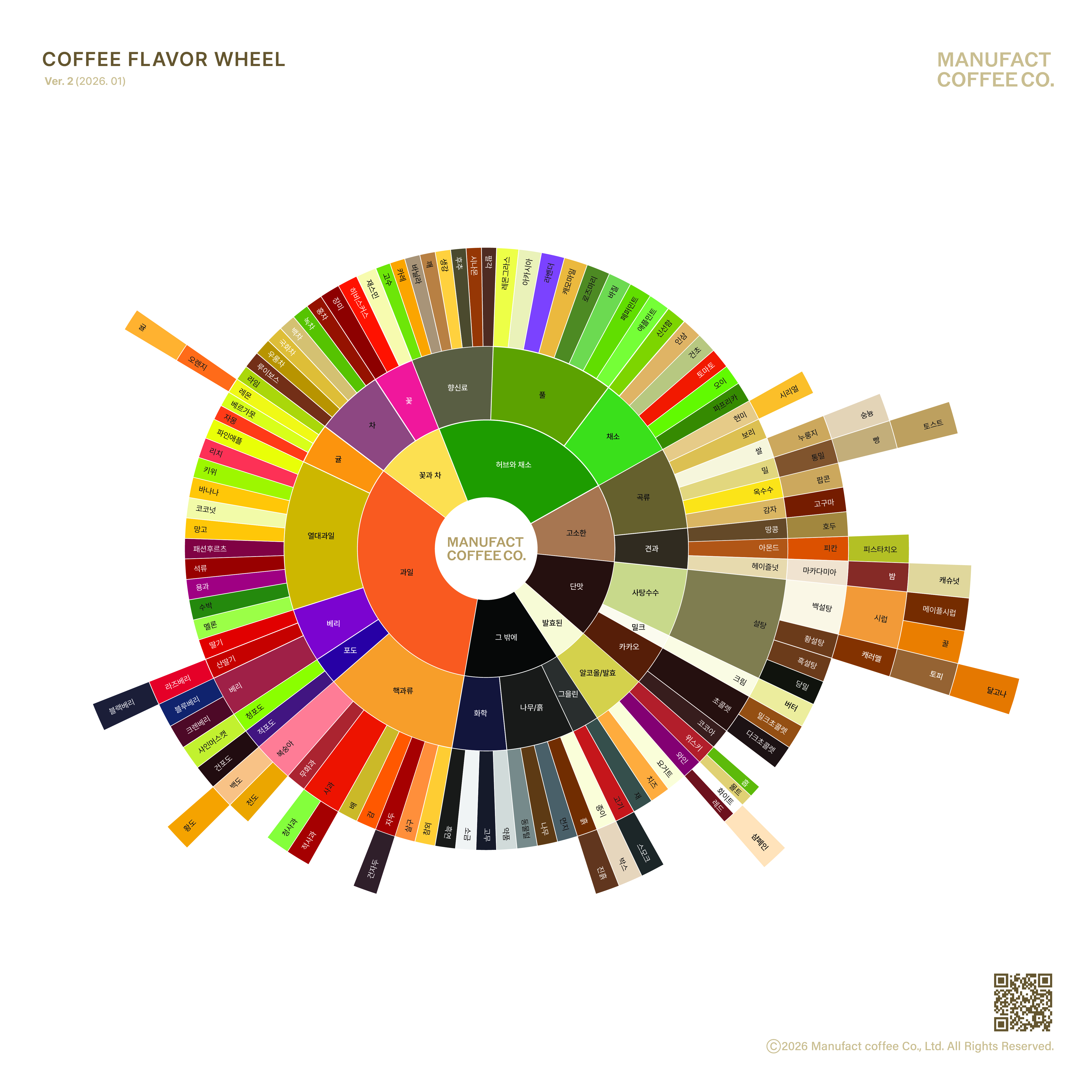 안녕하세요. 2026년 1월, 매뉴팩트커피 플레이버 휠이 리뉴얼 되었습니다. 매뉴팩트 구성원들은 매일 공장에서 로스팅되는 커피를 함께 맛보고 생각과 느낌을 나누는 시간을 가집니다.마찬가지로 직영 매장에서도 손님에게 제공하기 전 테스트를 거쳐 구성원들과 맛보고 이야기를 나눕니다. 모두가 공통된 언어와 표현으로 의견을 나누기 위해 이 플레이버 휠을 제작했습니다. 자유롭게 저장해 사용해주시기 바랍니다. 감사합니다. -MANUFACT COFFEE< COFFEE FLAVOR WHEEL > Ver.2 다운로드