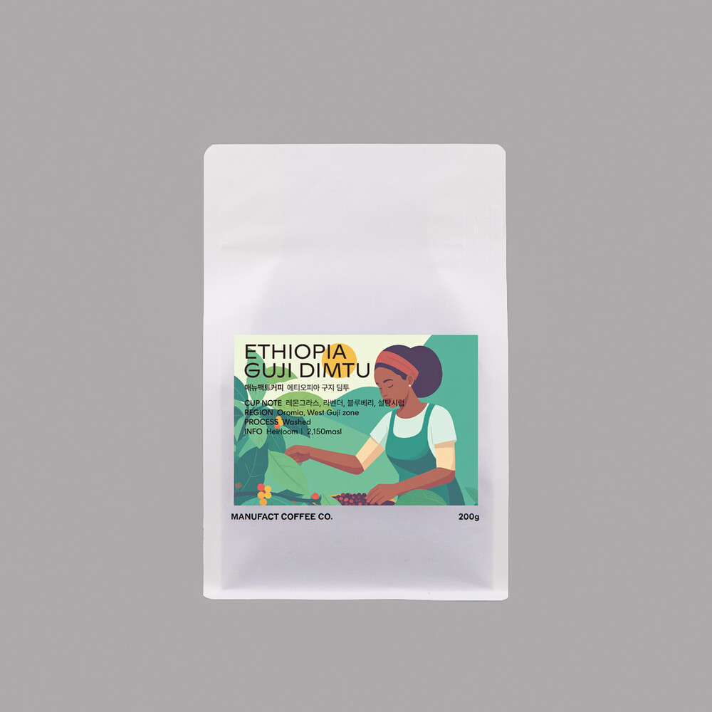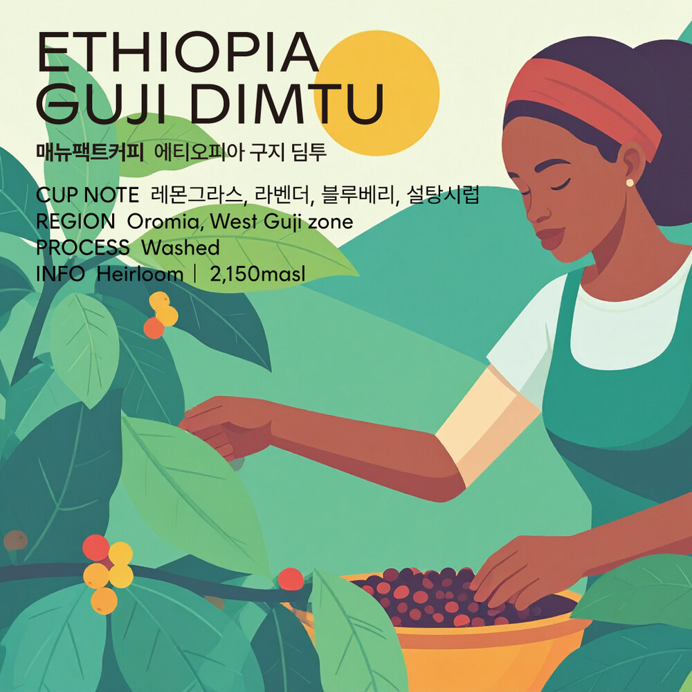 에티오피아 구지 딤투(Guji Dimtu)는 고품질 스페셜티 커피 생산지로서, 에티오피아 남부 오로미아(Oromia) 주의 구지(Guji) 존 내에 위치해 있습니다. 특히 '딤투'는 구지에서도 남쪽의 오로미아 주 지역으로, 풍부한 바디감으로 인기가 매우 높습니다.