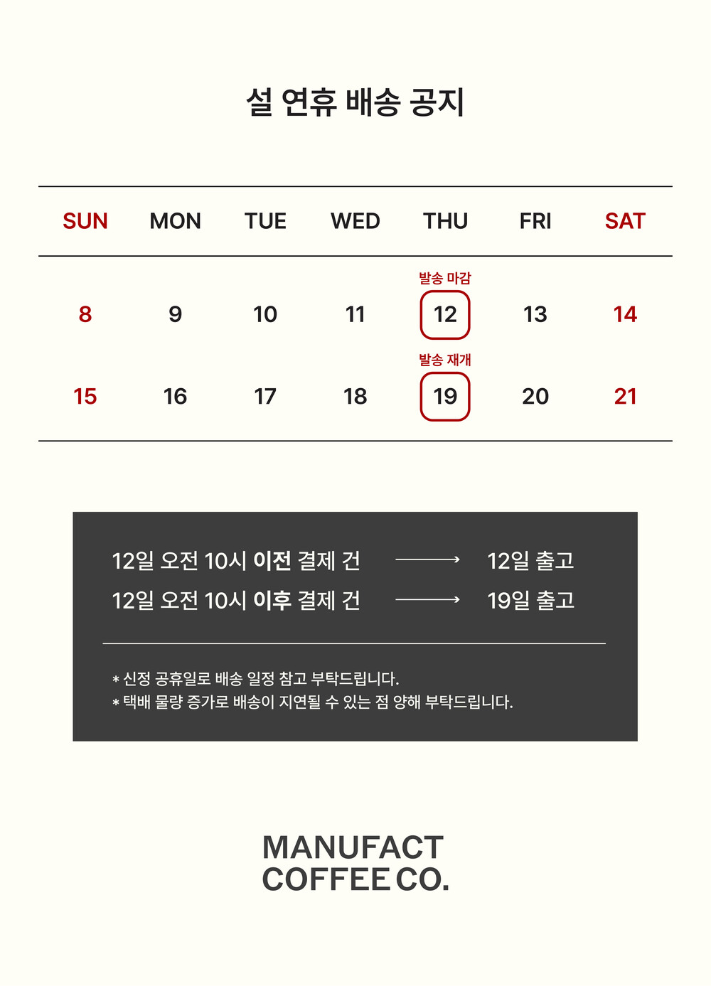 4. 법정 공휴일 및 토, 일요일은 택배사 및 생산공장 휴무로 인해 상품 발송 및 배송이 없습니다.