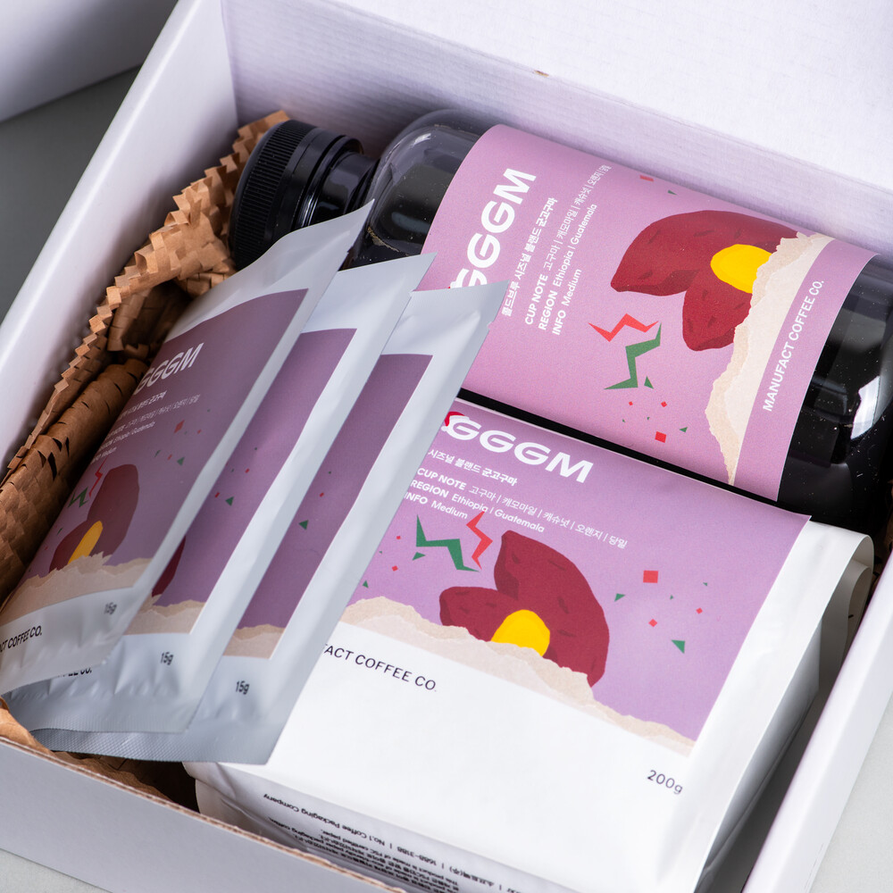 고구마와 귤이 자연스레 생각나는 겨울, 따뜻하게 구워진 군고구마의 포근함을 떠올리며 만들어진 겨울 시즌 블렌드 GGGM입니다. 에티오피아와 과테말라의 커피를 정교하게 블렌딩해 따뜻하고 부드러운 겨울 감성을 완성했습니다. 커피 한 잔에서 고구마의 담백한 단맛과 캐모마일의 은은한 꽃향, 캐슈넛의 고소함과 오렌지의 기분 좋은 산미가 조화롭게 이어집니다.